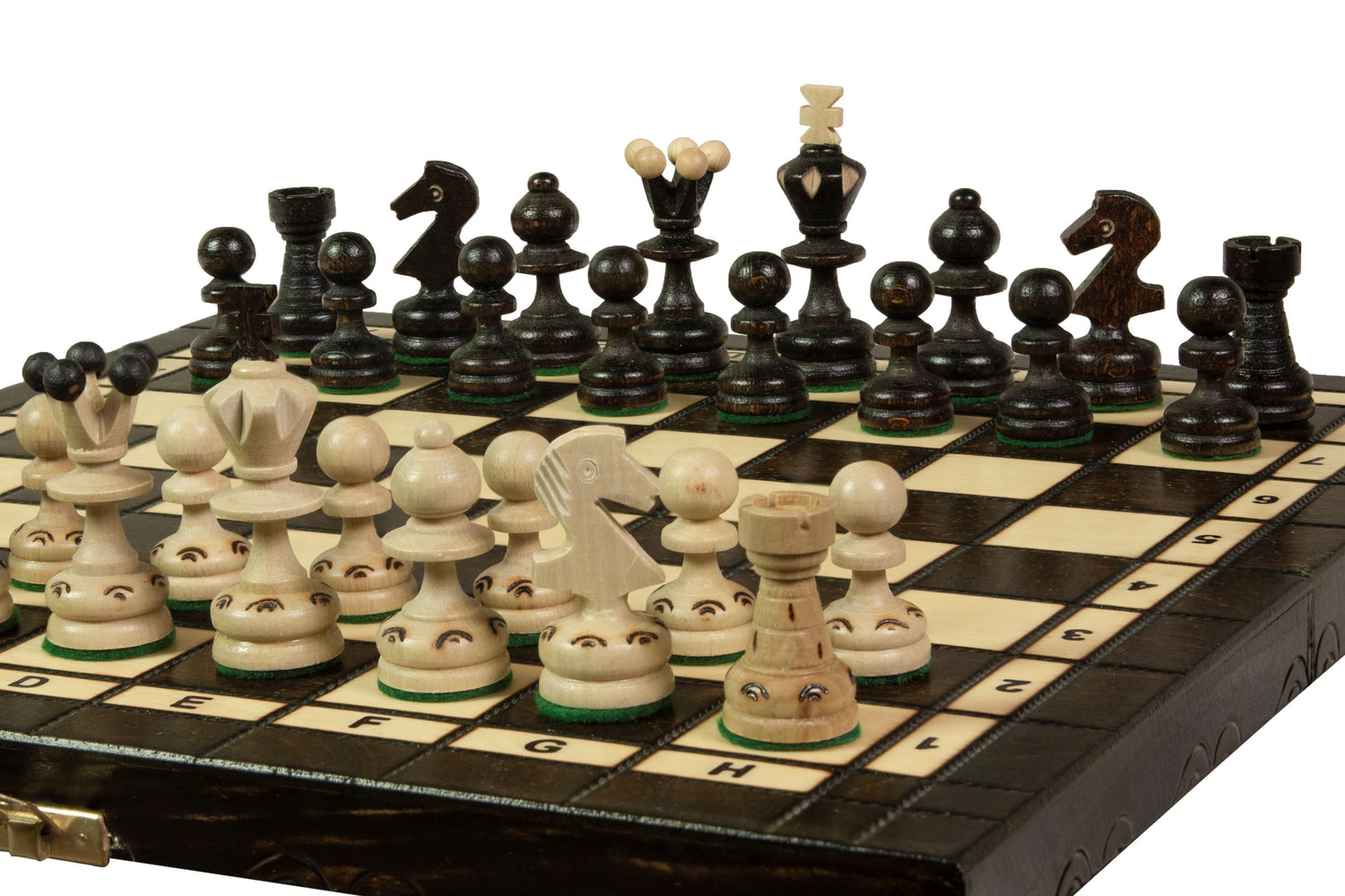 Questi scacchi tradizionali polacchi sono realizzati con il nostro legno locale. Particolarmente degni di nota sono i pezzi decorati con motivi intagliati a mano. Il re e l'hetman sono stati appositamente tagliati e decorati con elementi decorativi - sfere e una croce. La scacchiera � stata realizzata a fuoco con quadrati dipinti a mano.