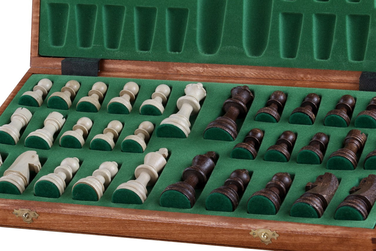 Il set è composto dalla nostra scacchiera pieghevole in legno intarsiato di mogano e sicomoro e dalle nostre Staunton polacche realizzate sulla base delle popolari figure indiane in stile tedesco (chiamate anche Timeless - vedi DGT).