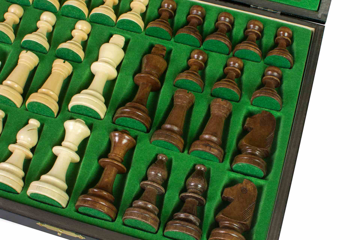 Scacchi a Staunton n.5 CHW26 ART , così come alcune altre figure di scacchi in stile Staunton delle stesse dimensioni, cioè Re da 90 mm, possono essere offerte come set insieme a una valigetta in legno molto gradevole dal punto di vista estetico per la loro conservazione, dotata di inserti corrispondenti alle singole figure (trovi anche la versione con la valigetta Marrone)